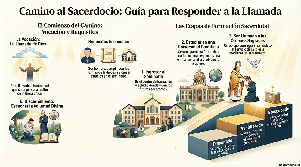 Hay unos pasos a seguir para ser sacerdote en España desde que se siente la llamada y vocación, hasta que se forma y recibe el sacramento de la ordenación sacerdotal.